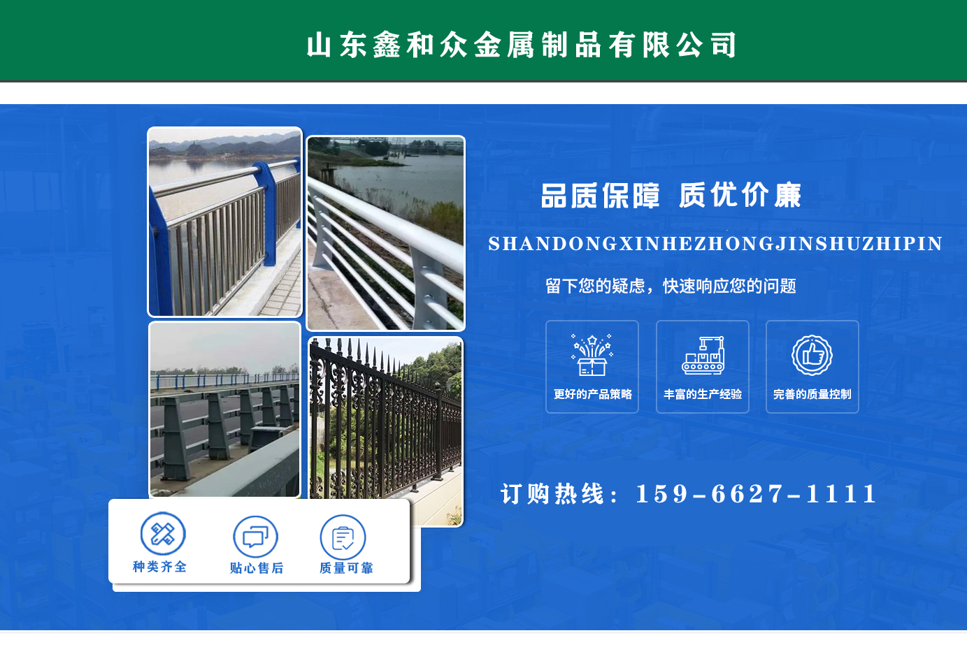 山東鑫和眾金屬制品有限公司主要產(chǎn)品有防撞護欄,橋梁護欄,道路護欄,河道護欄,不銹鋼護欄等護欄。提供設計方案,一站式定制,包您滿意價格優(yōu)惠,歡迎來電咨詢!    公司常年從事銷售護欄防撞護欄,橋梁護欄,道路護欄,河道護欄,不銹鋼護欄,橋梁鋼護欄,河道燈光護欄等。產(chǎn)品廣泛應用于橋梁、河道、旅游景區(qū)、道路、公路、公園、小區(qū)、景觀、道路防撞等領域。    公司產(chǎn)品均采用優(yōu)質(zhì)不銹鋼材料,符合相關(guān)標準。各種型號不銹鋼復合管及護欄,質(zhì)量嚴格把控。產(chǎn)品強度高、耐腐蝕、焊接牢固、抗沖擊、性能好,防撞護欄結(jié)構(gòu)簡單、美觀實用大方。     歡迎前來訂購!...
